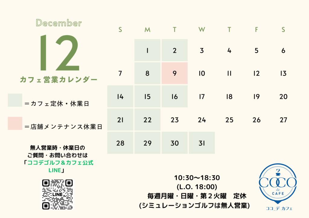 ※12月2日・16日は出張販売実施による店長不在のため、カフェ休業およびゴルフ無人営業となります