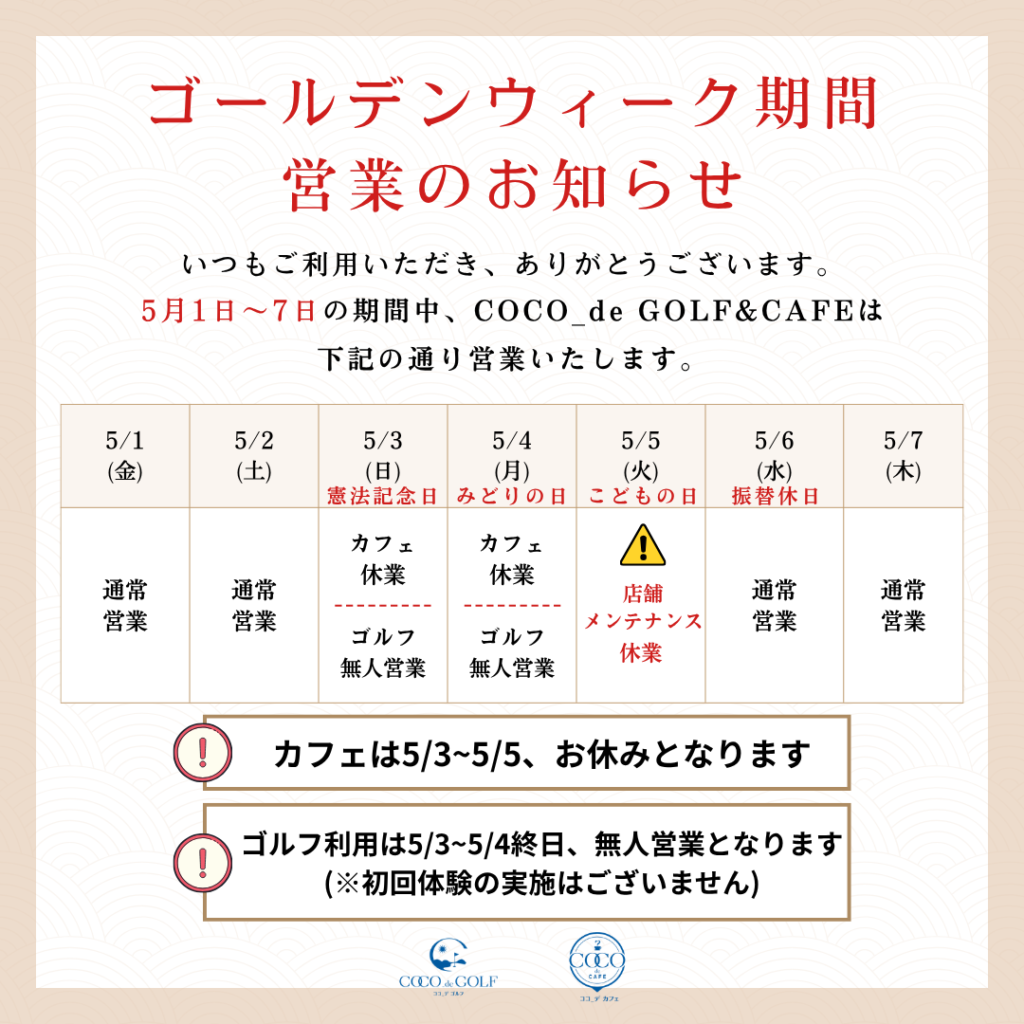 ゴールデンウィーク期間中、営業日のご案内